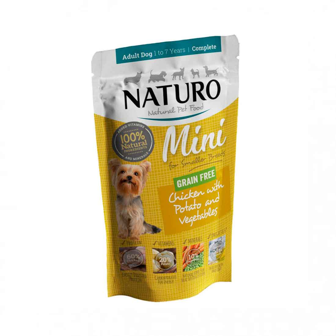 Naturo Dog Mini Adult Grain Free pollo/patatas en pouche, alimento 100% natural rico en carne de pollo (60%). Contiene también patatas (26%), vegetales, aceites y minerales. No contiene subproductos ni colorantes ni conservantes. Especialmente indicado para perros hipoalergénicos o con estómagos sensibles.
