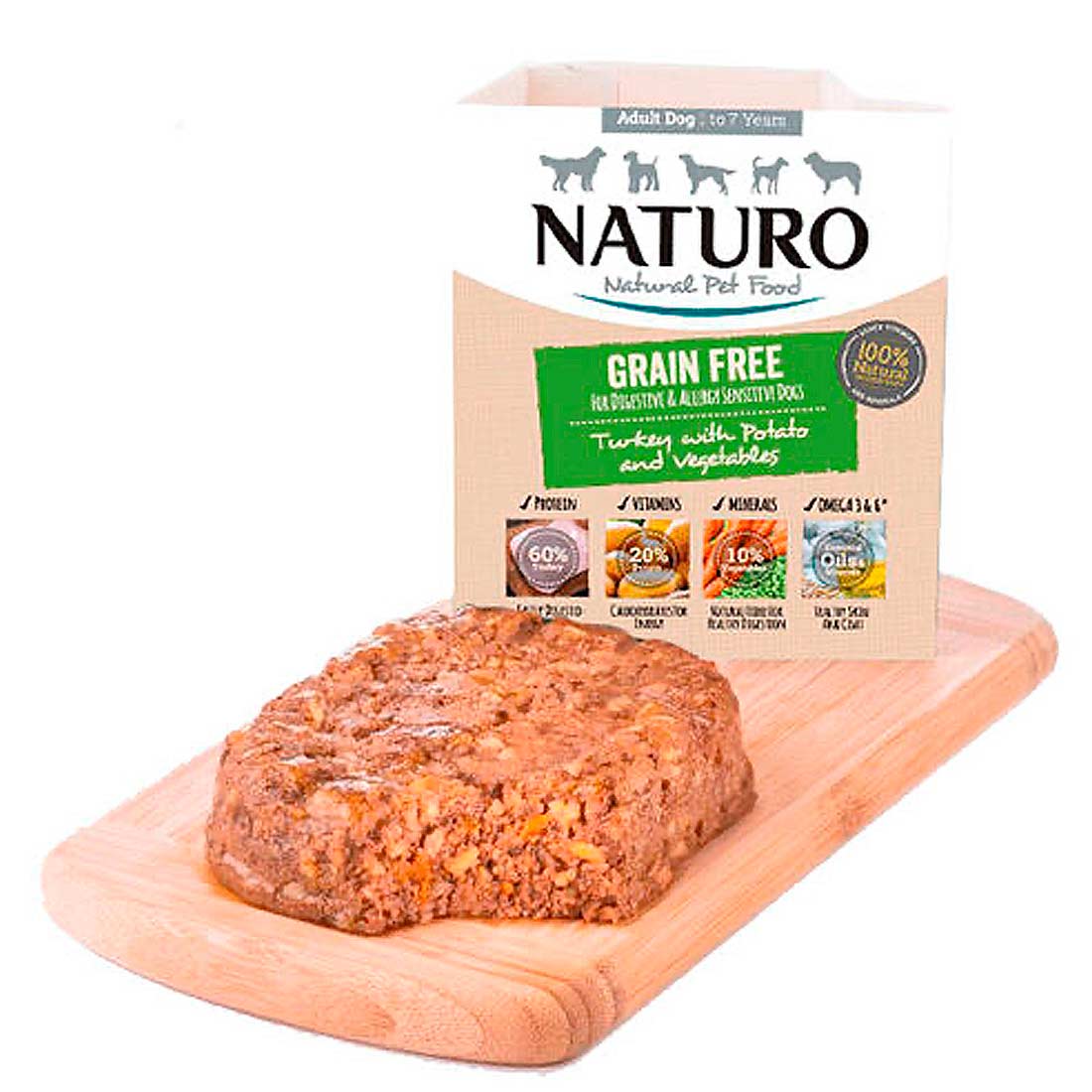 La tarrina de Naturo sin cereales es ideal para perros adultos ya que evita las intolerancias alimentarias y favorece una piel y pelaje brillante.